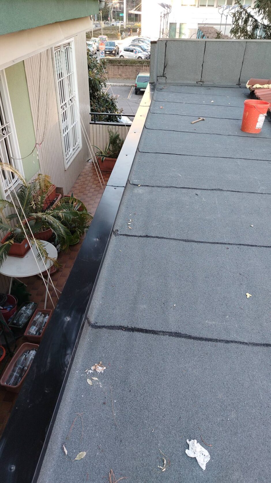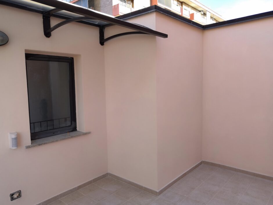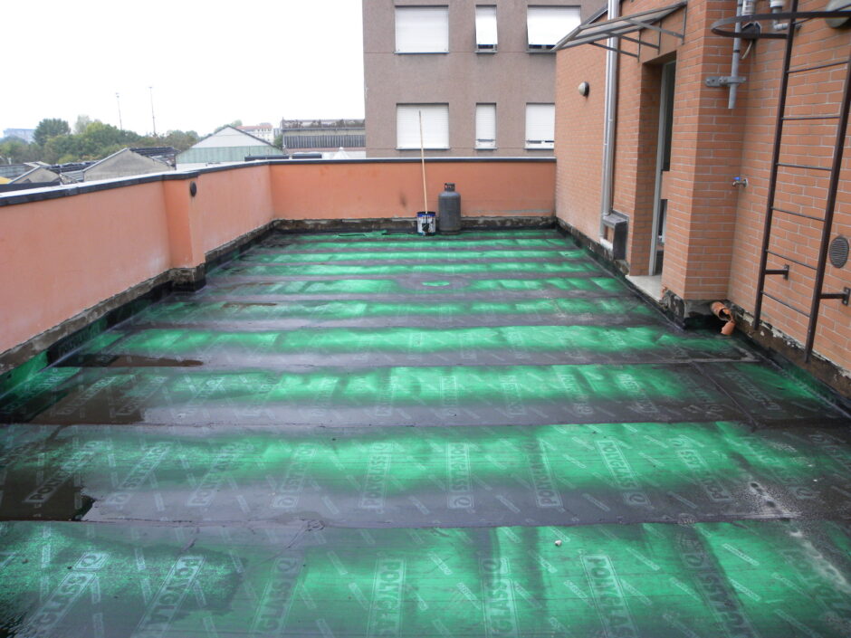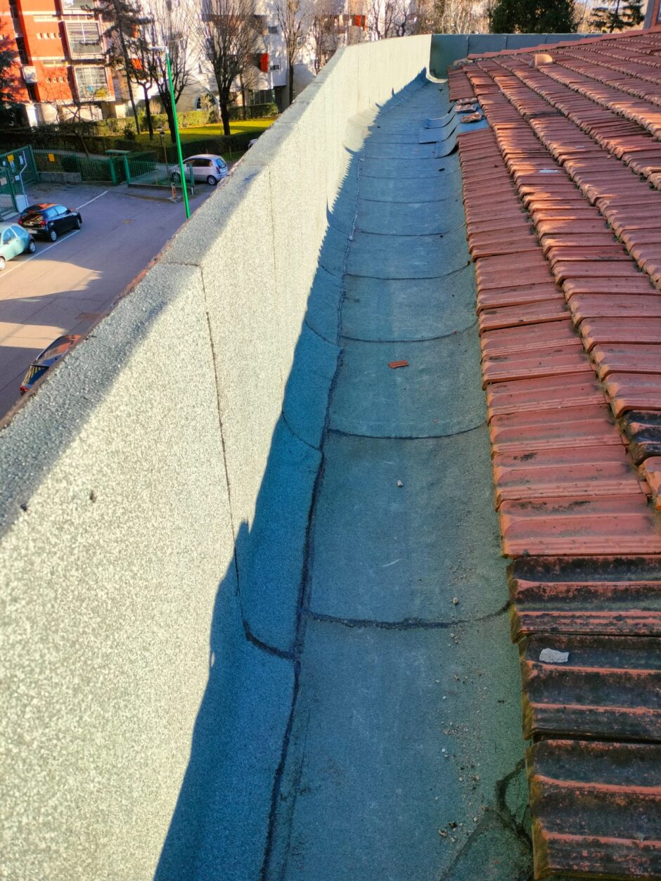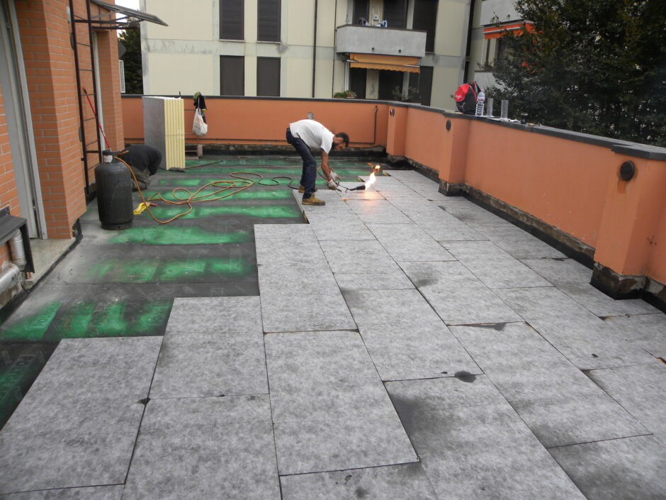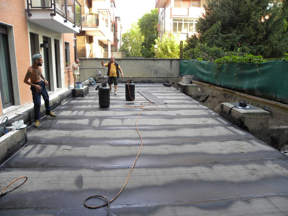 Palazzina costruita negli anni 80, presentava problemi infiltrativi negli appartamento agli ultimi piani, per tale motivo è stato necessario effettuare uno studio preliminare al fine di progettare un intervento corretto. Tra le varie ipotesi è stata scelta la procedura di non rimuovere il fondo sottostante di guaina esistente (in mediocre condizioni, utilizzata come fondo finito per applicare il nuovo strato di guaina del tipo ardesiato posato a cannello). Al fine di rendere solidali i due strati, il primo strato esistente è stato ancorato alla soletta strutturale mediante tasselli tipo “speak”. Tale soluzione ha permesso di ottimizzare i tempi esecutivi e di risoluzione al problema infiltrativo, nonché si è avuto un notevole risparmio economico in termini di abbattimento dei costi di demolizione e di smaltimento, praticamente nulli. Il Lavoro è stato completato a regola d’arte risvoltando con le guaine sui muretti verticali, sino alla testa del parapetto, sui quali sono stati posate le nuove lattonerie in lamiera color nero, dotate di doppio gocciolatoio e tra un tratto e l’altro di sormonti pari a 10 cm . Completa l’opera finiture e stuccature sottogronda e pitturazione finale dei comignoli.