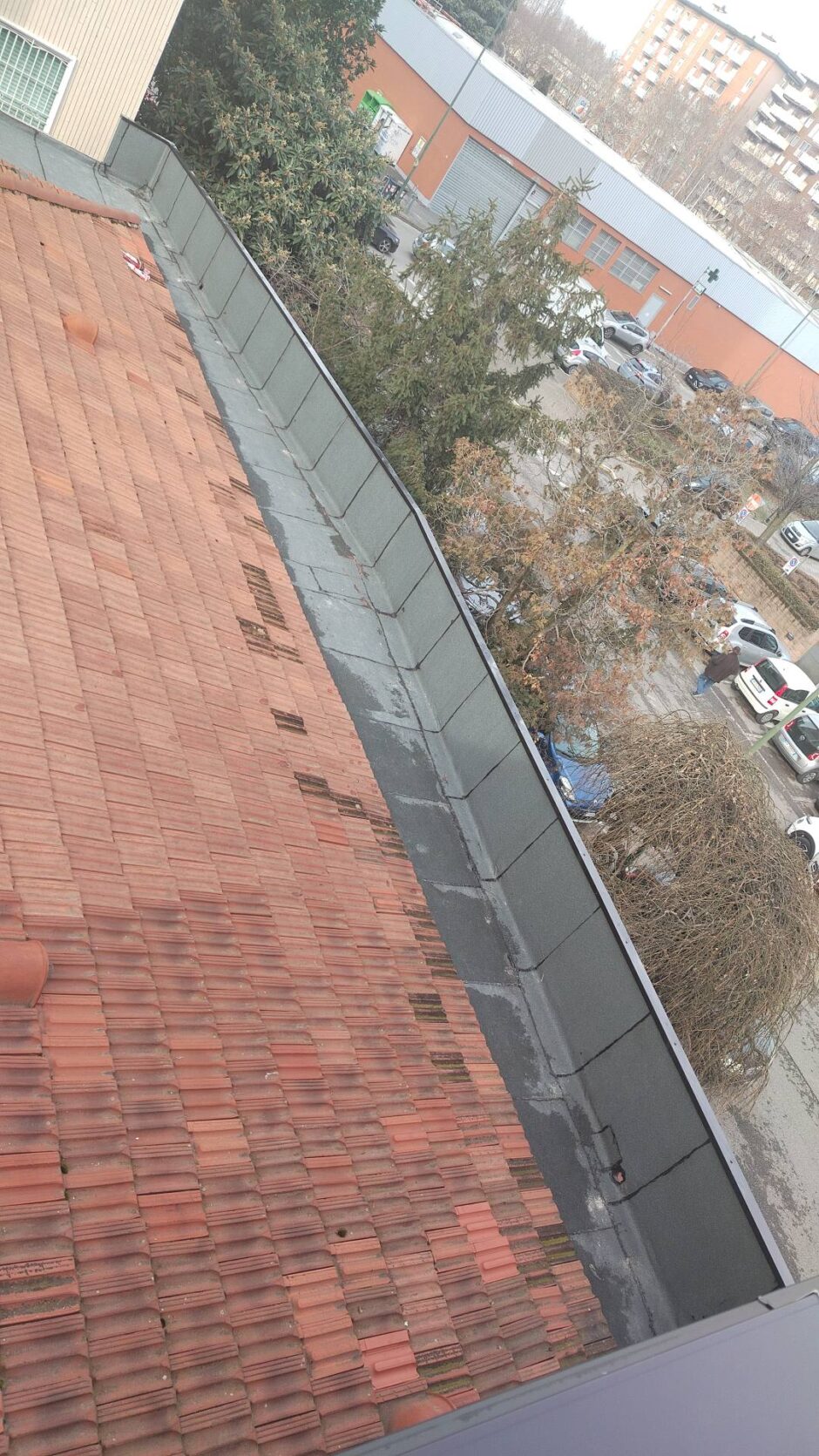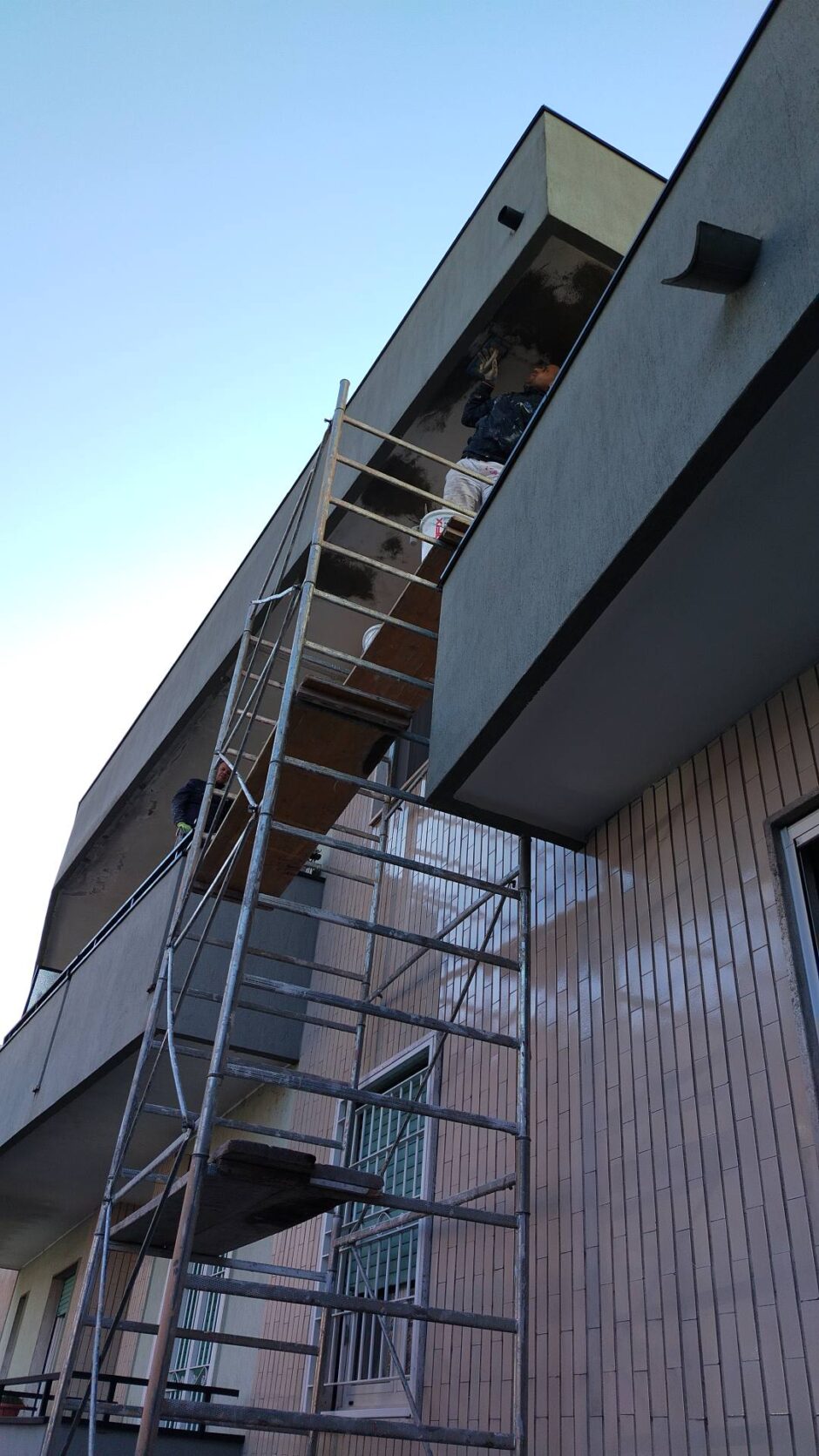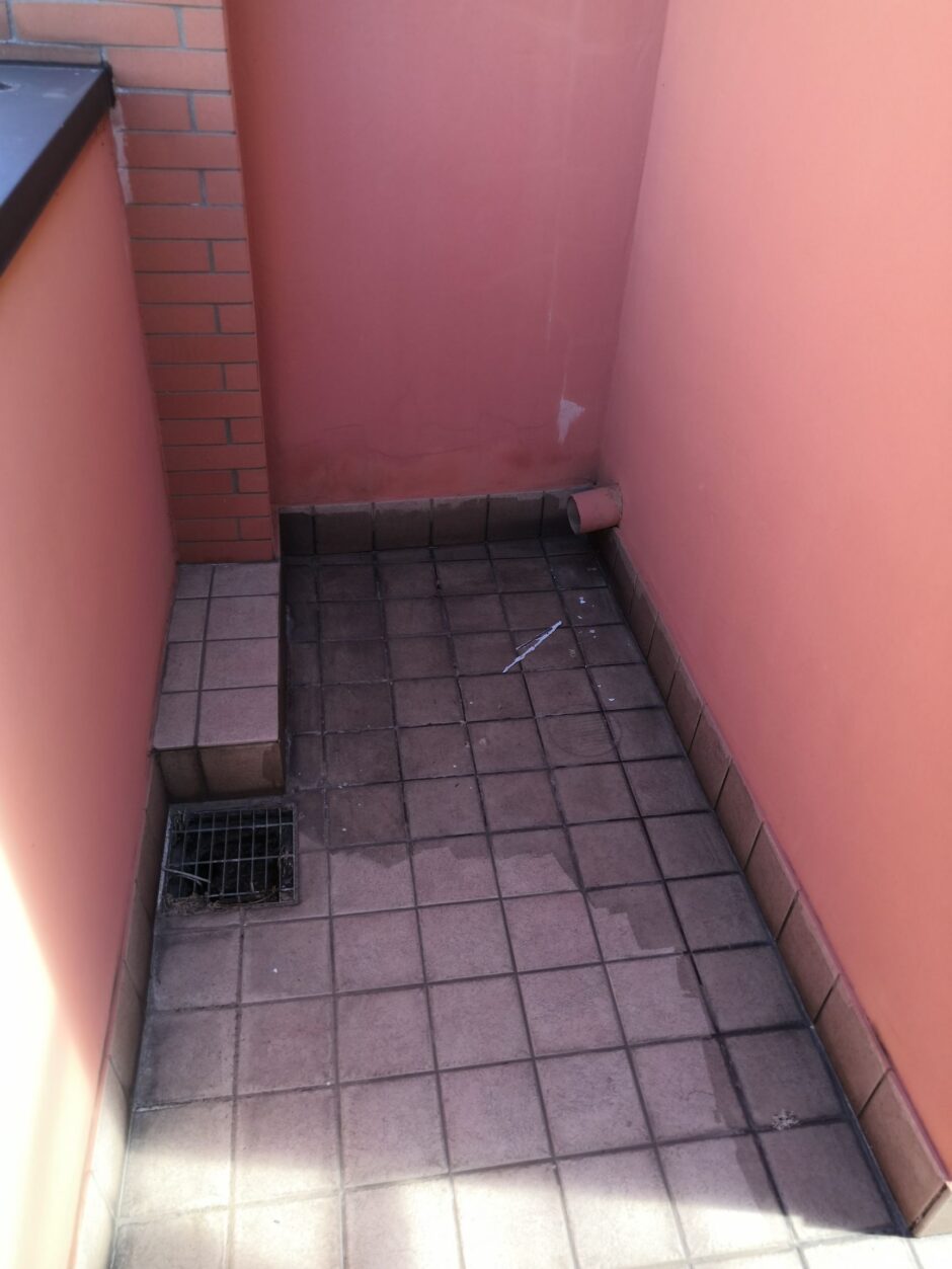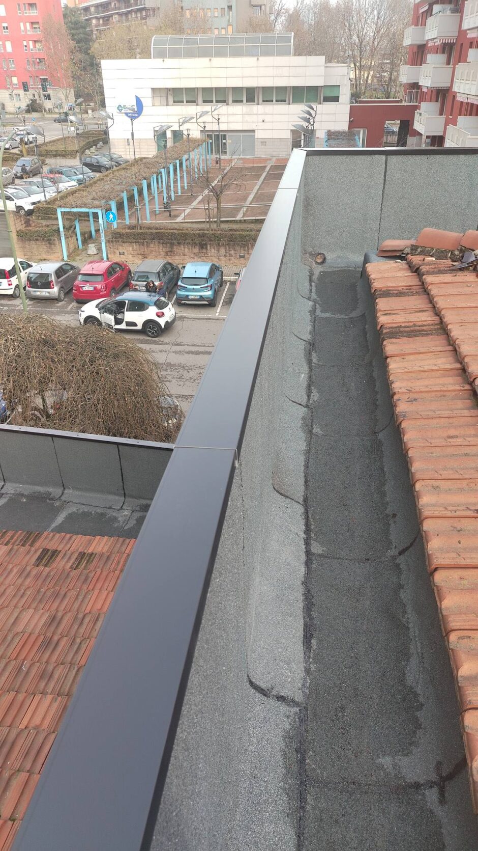 Palazzina costruita negli anni 80, presentava problemi infiltrativi negli appartamento agli ultimi piani, per tale motivo è stato necessario effettuare uno studio preliminare al fine di progettare un intervento corretto. Tra le varie ipotesi è stata scelta la procedura di non rimuovere il fondo sottostante di guaina esistente (in mediocre condizioni, utilizzata come fondo finito per applicare il nuovo strato di guaina del tipo ardesiato posato a cannello). Al fine di rendere solidali i due strati, il primo strato esistente è stato ancorato alla soletta strutturale mediante tasselli tipo “speak”. Tale soluzione ha permesso di ottimizzare i tempi esecutivi e di risoluzione al problema infiltrativo, nonché si è avuto un notevole risparmio economico in termini di abbattimento dei costi di demolizione e di smaltimento, praticamente nulli. Il Lavoro è stato completato a regola d’arte risvoltando con le guaine sui muretti verticali, sino alla testa del parapetto, sui quali sono stati posate le nuove lattonerie in lamiera color nero, dotate di doppio gocciolatoio e tra un tratto e l’altro di sormonti pari a 10 cm . Completa l’opera finiture e stuccature sottogronda e pitturazione finale dei comignoli.