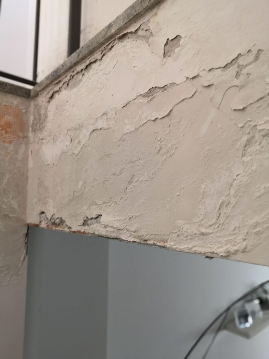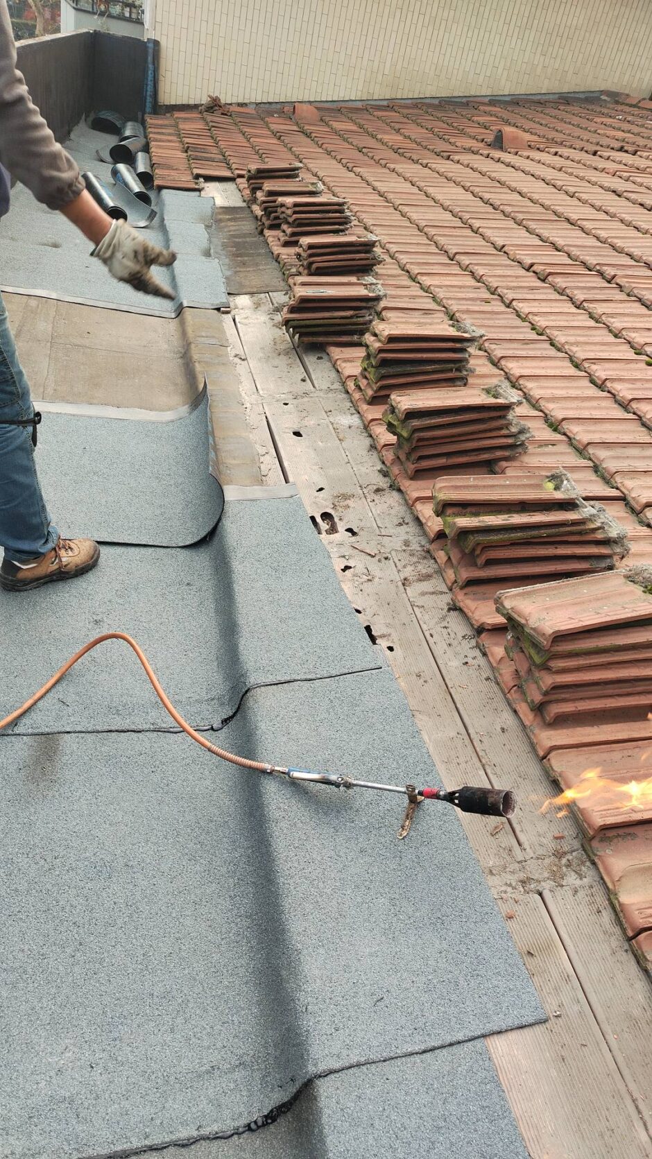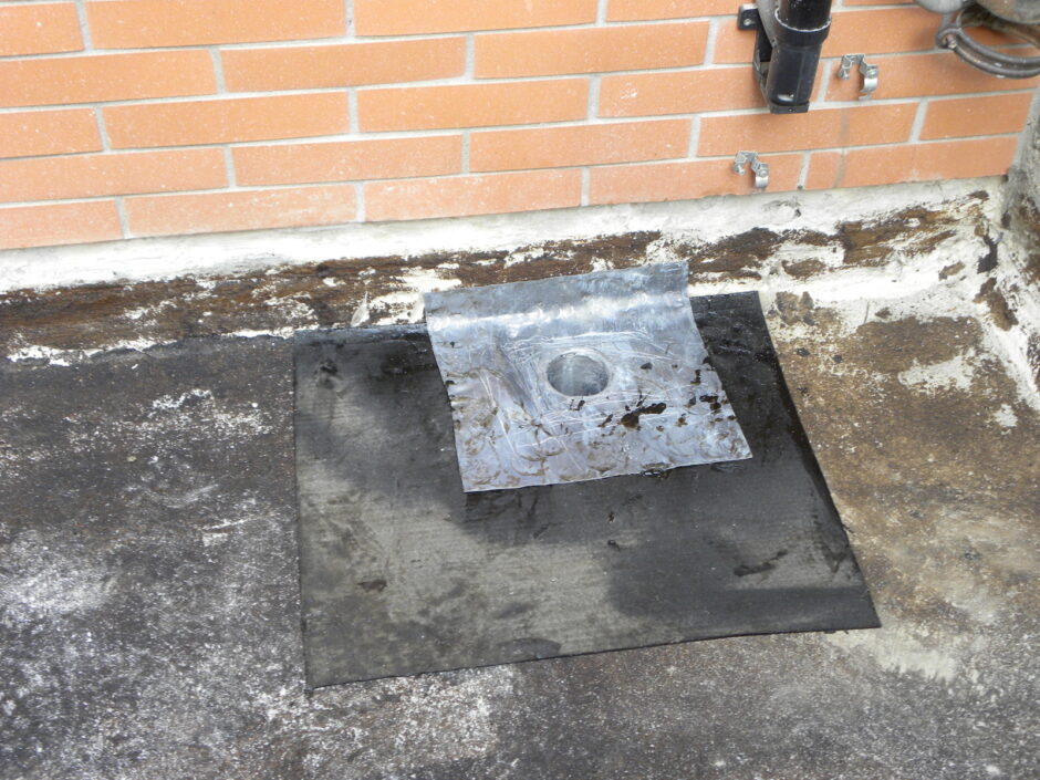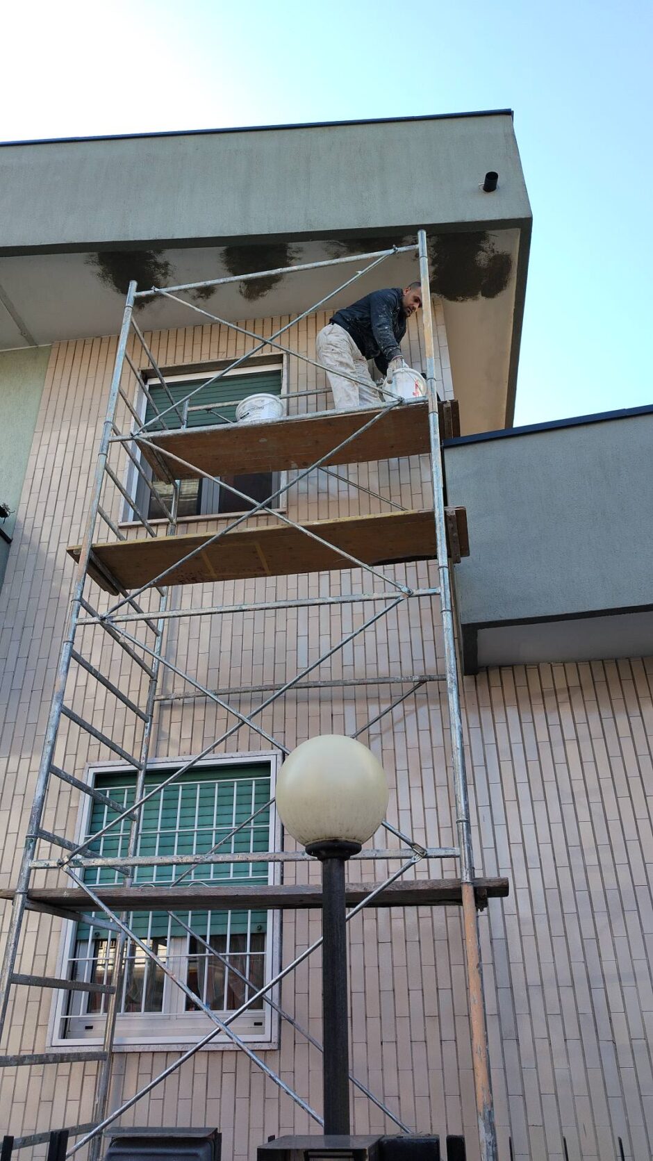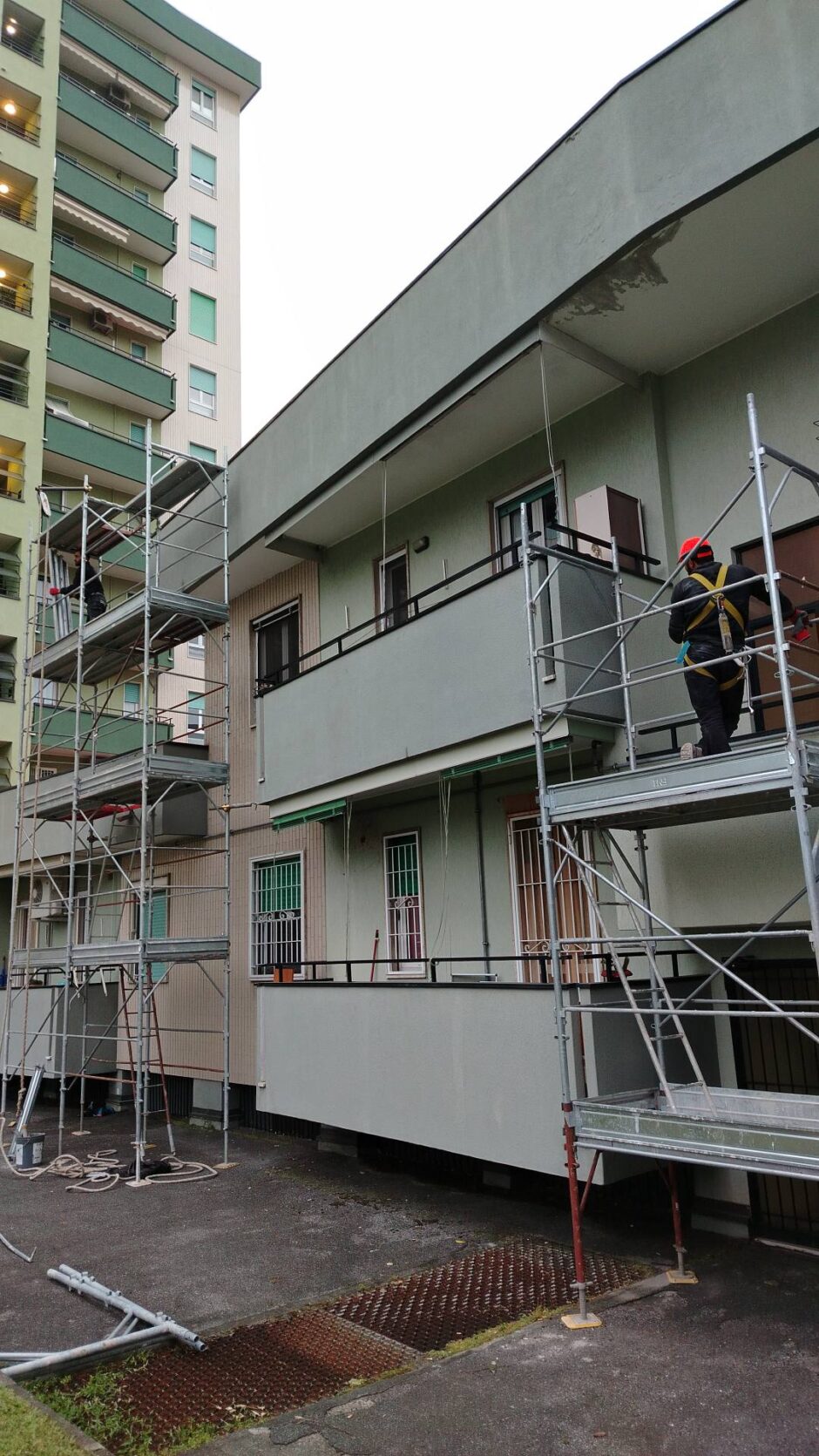 Palazzina costruita negli anni 80, presentava problemi infiltrativi negli appartamento agli ultimi piani, per tale motivo è stato necessario effettuare uno studio preliminare al fine di progettare un intervento corretto. Tra le varie ipotesi è stata scelta la procedura di non rimuovere il fondo sottostante di guaina esistente (in mediocre condizioni, utilizzata come fondo finito per applicare il nuovo strato di guaina del tipo ardesiato posato a cannello). Al fine di rendere solidali i due strati, il primo strato esistente è stato ancorato alla soletta strutturale mediante tasselli tipo “speak”. Tale soluzione ha permesso di ottimizzare i tempi esecutivi e di risoluzione al problema infiltrativo, nonché si è avuto un notevole risparmio economico in termini di abbattimento dei costi di demolizione e di smaltimento, praticamente nulli. Il Lavoro è stato completato a regola d’arte risvoltando con le guaine sui muretti verticali, sino alla testa del parapetto, sui quali sono stati posate le nuove lattonerie in lamiera color nero, dotate di doppio gocciolatoio e tra un tratto e l’altro di sormonti pari a 10 cm . Completa l’opera finiture e stuccature sottogronda e pitturazione finale dei comignoli.
